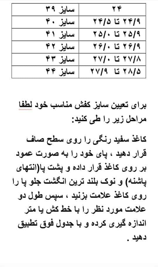 لطفا قبل از نهایی کردن سفارش خود سایز پای خود را با جدول راهنمای سایز در گالری تصاویر تطبیق دهید.